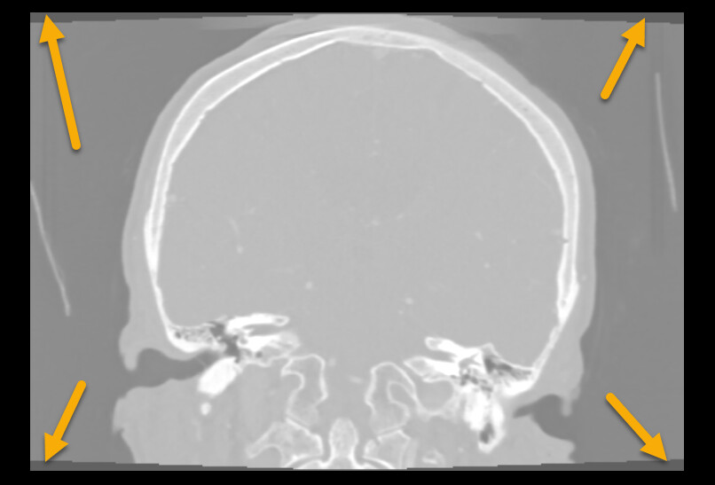 The image edges coincide edge of anatomy (skull touches the image edge). This is an issue because image processing methods often need to extrapolate a little bit beyond the image region and this extrapolation will fail if the intensity near the image edge is non-uniform (it is fine if the image edge cuts through the middle of tissue or cuts through the middle of air, but the image edge should not be at an anatomical region boundary).