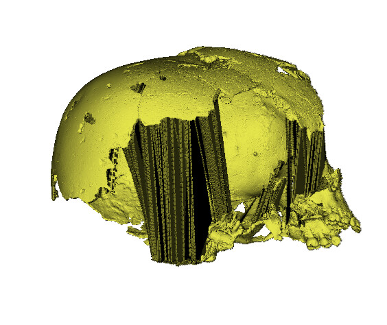 A potential issue, however, is that the fragmented skull is just an .obj surface mesh. Converting this to a segmentation → Export models and labelmaps → Export to new labelmap, creates anomalies and artefacts in the volume (bottom: surface mesh, top: labelmap volume in 3D rendering). This might be ok, but I will have to test it out.