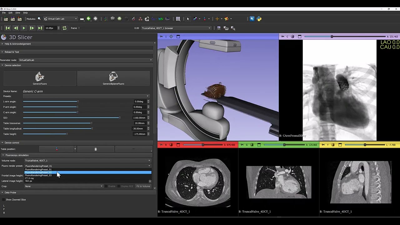 Virtual Cath Lab module has been recently added to SlicerHeart extension. This module simulates monoplane and biplane C-arm systems: provides 3D model of the C-arm, table, patient and generates simulated fluoroscopy images. Images can be either static (generated from 3D CT) or dynamic (generated from 4DCT). The module can also display cardiac devices (stents, occluders, clips, etc. provided by the Cardiac Device Simulator module) and virtual contrast filling (from image segmentation).